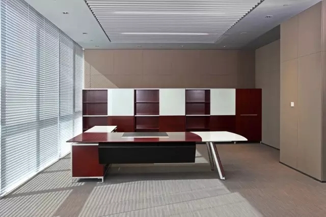 主管桌选用与接待区红木家具一致的颜色,实现整体办公空间的风格统一。侧桌贴心配备冰箱、碎纸机等,提升高管办公生活。